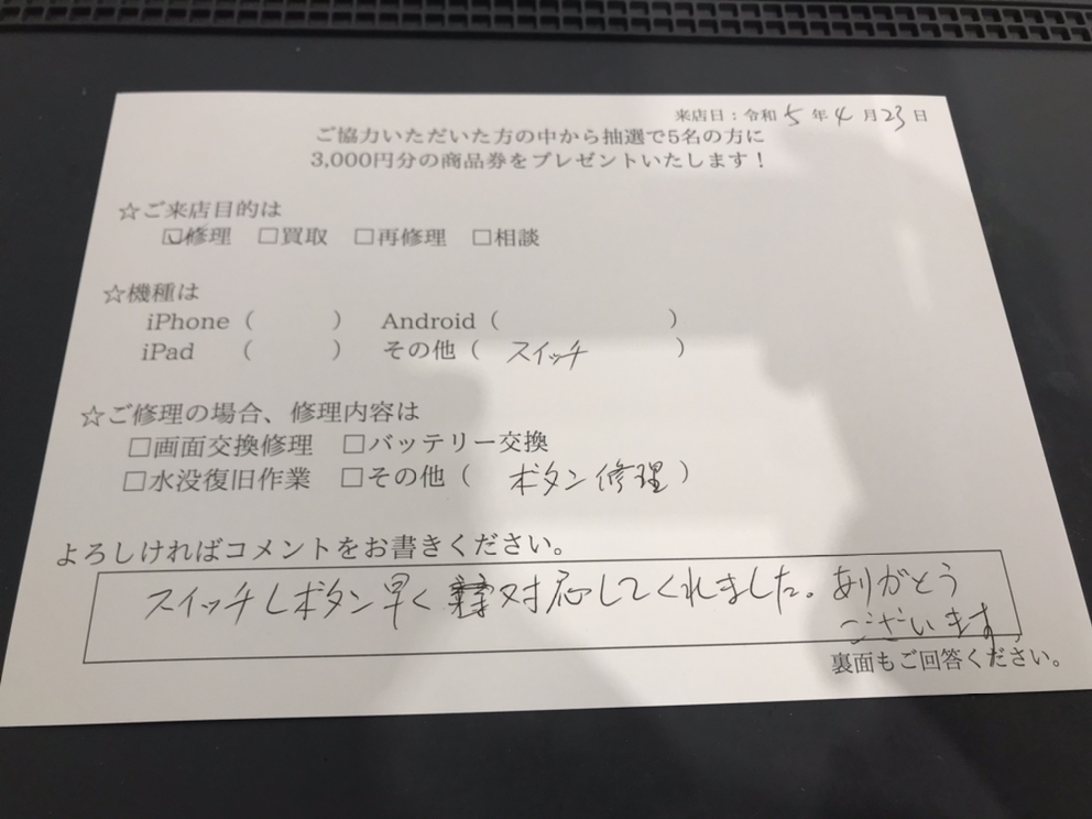 スマホスピタル 新宿 switchLボタンケーブル交換修理のお客様よりコメントをいただきました。
