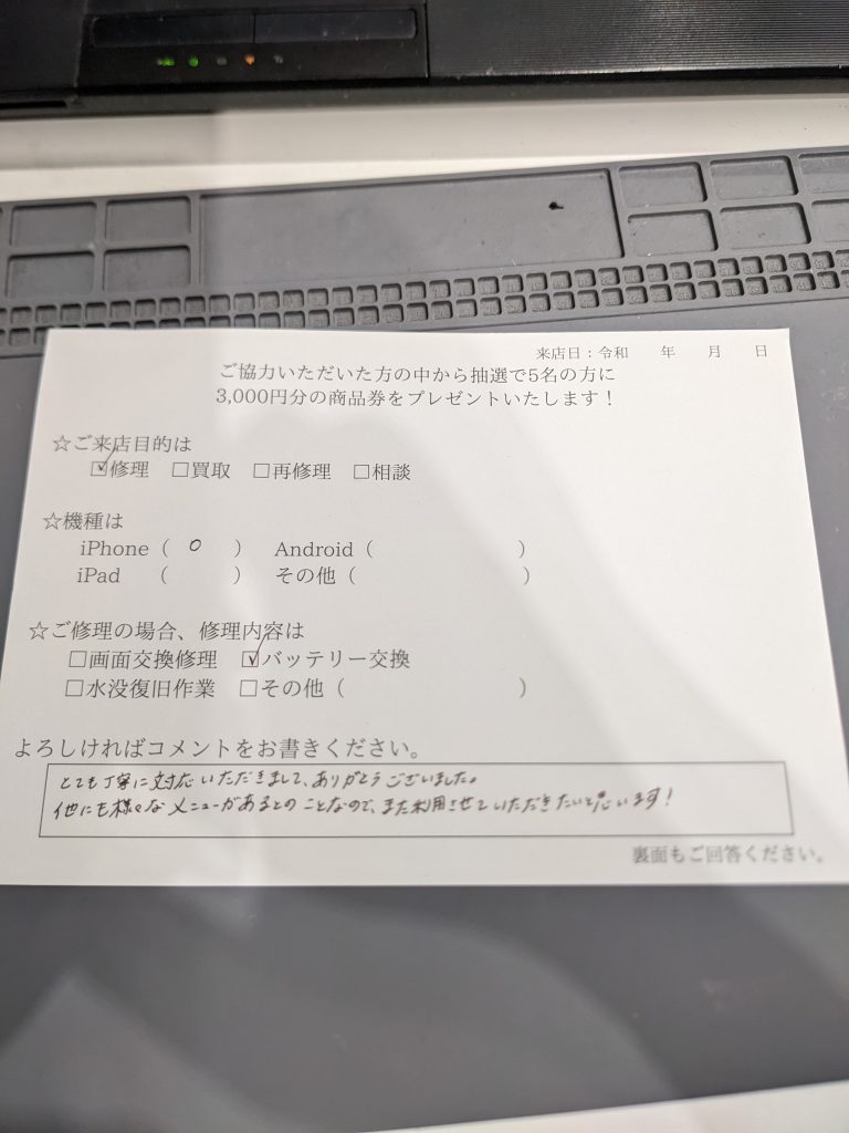 スマホスピタル 新宿 iPhone12proバッテリー交換のお客様よりコメントを頂きました。