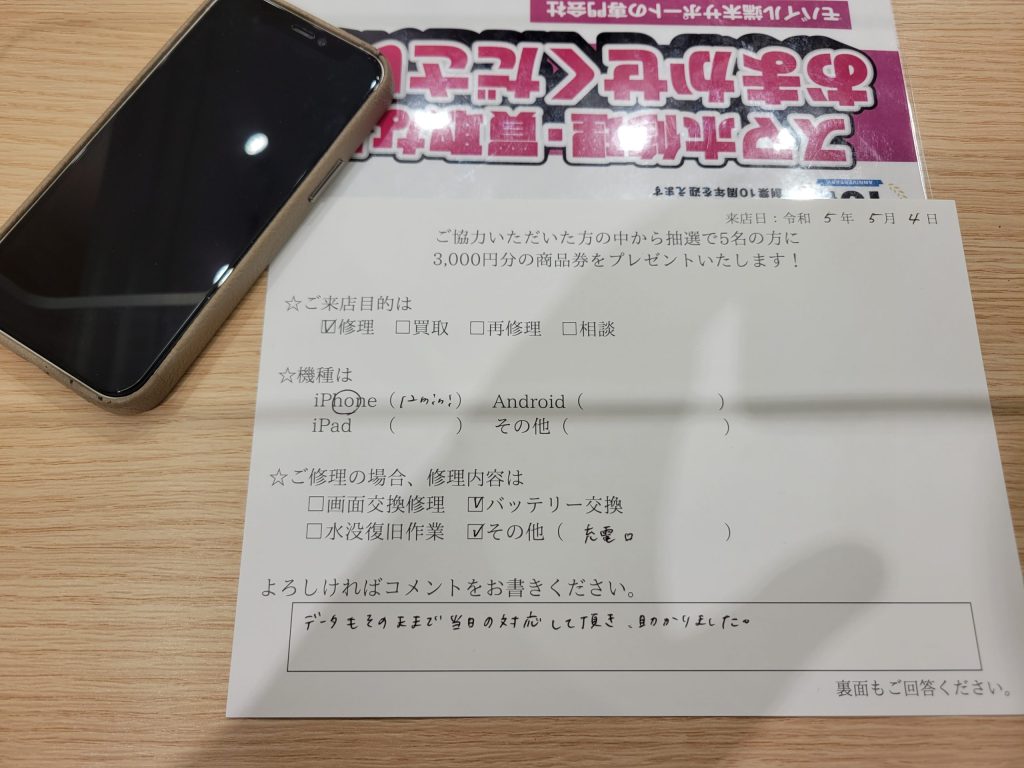 スマホスピタル 新宿 iPhone 12miniのバッテリー交換&充電口交換のお客様からコメントをいただきました