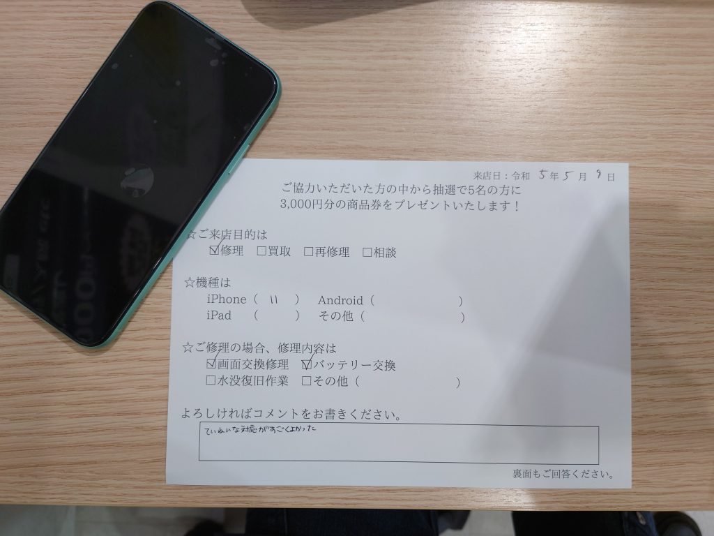スマホスピタル 新宿 iPhone11画面、バッテリー交換修理のお客様よりコメントを頂きました。