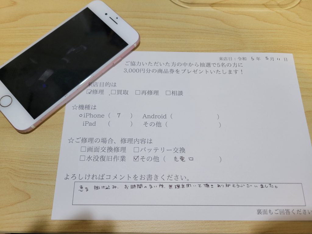 スマホスピタル 新宿 iPhone7のドックコネクター修理のお客様よりコメントを頂きました。