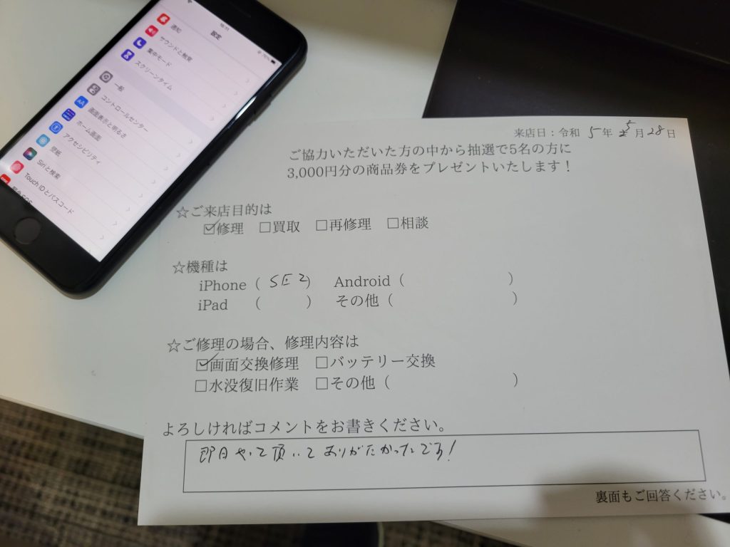 スマホスピタル 新宿 iPhone SE2の画面交換修理のお客様からコメントをいただきました