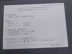スマホスピタル 新宿 iPhoneSE2のバッテリー交換修理のお客様よりコメントを頂きました。