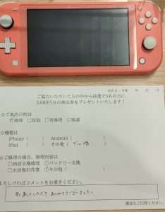 スマホスピタル 新宿 Switch Lite修理のお客様からコメントを頂きました