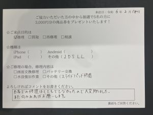 スマホスピタル 新宿 New2DSLLのスライドパッド修理のお客さまからコメントを頂きました。