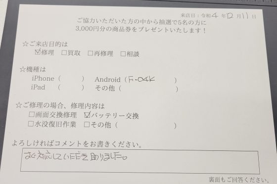 arrows Beのバッテリー交換修理のお客様からコメントを頂きました