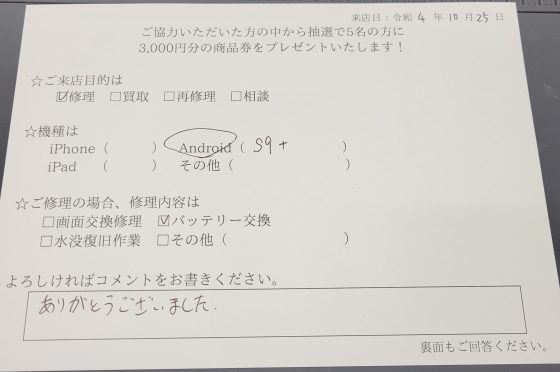 Galaxy S9+のバッテリー交換修理のお客様からコメントをいただきました!