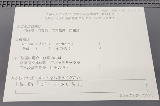 iPhone 11proの画面交換のお客様からコメントをいただきました!