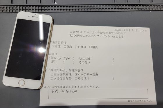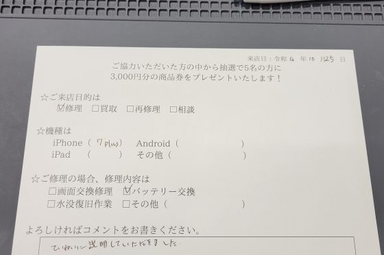 iPhone 7Plusのバッテリー交換のお客様からコメントを頂きました