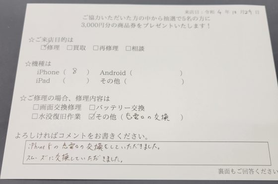 iPhone 8のドックコネクター交換修理のお客様からコメントをいただきました!