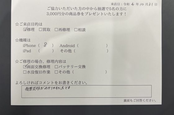 iPhone 8の画面交換修理のお客様からコメントをいただきました!