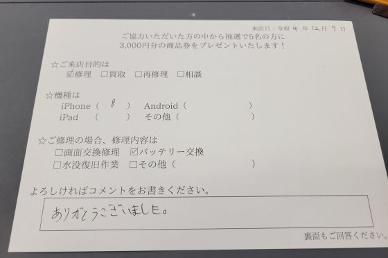 iPhone8 バッテリー交換のお客様よりコメントを頂きました。