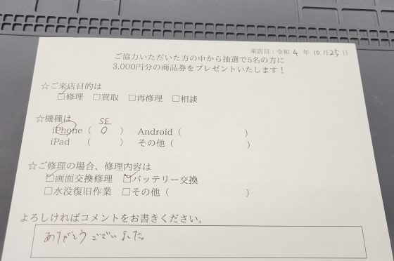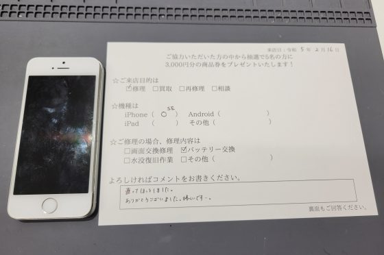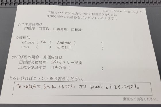 iPhone SEのバッテリー交換修理のお客様からコメントをいただきました