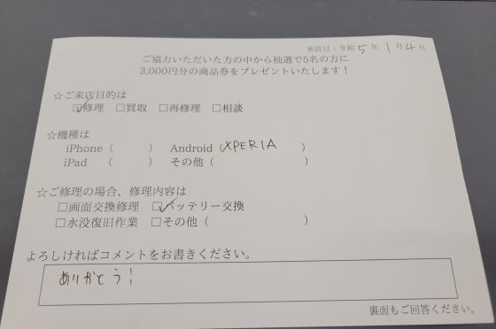 Xperiaのバッテリー交換のお客様からコメントを頂きました