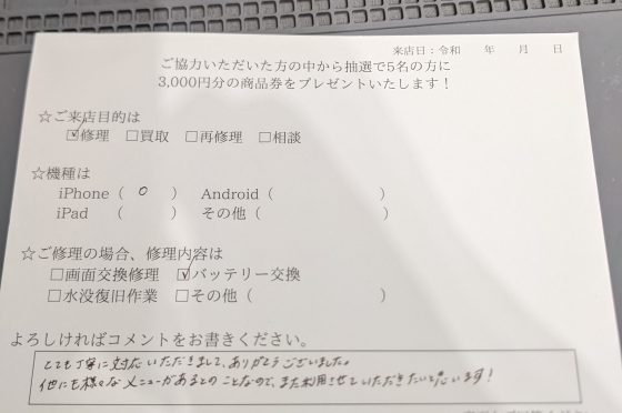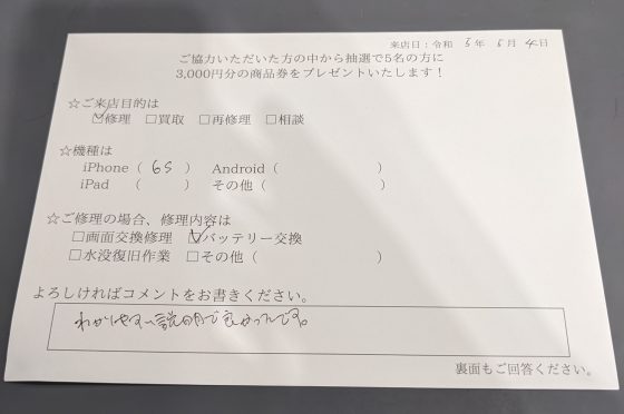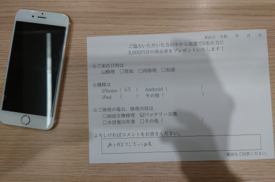 iPhone6Sのバッテリー交換のお客様よりコメントを頂きました。