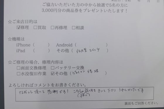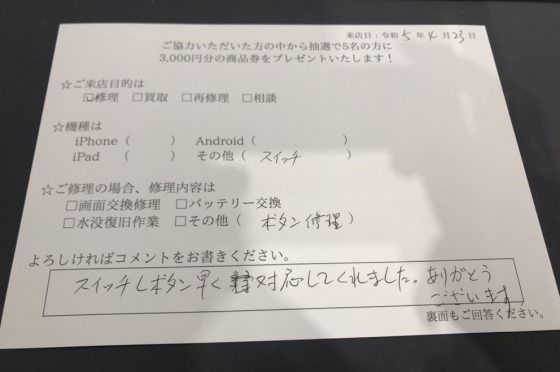 switchLボタンケーブル交換修理のお客様よりコメントをいただきました。