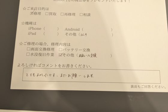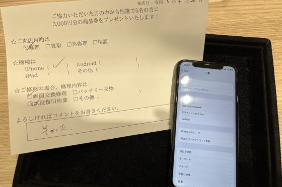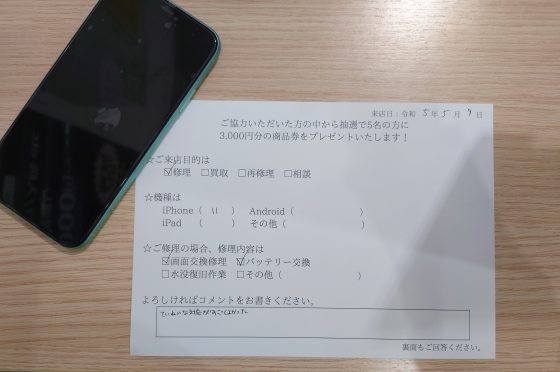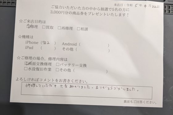 iPhoneSE2の画面交換のお客様よりコメントをいただきました。