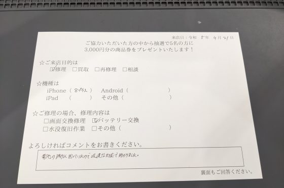 iPhone6sのバッテリー交換のお客様からコメントを頂きました。