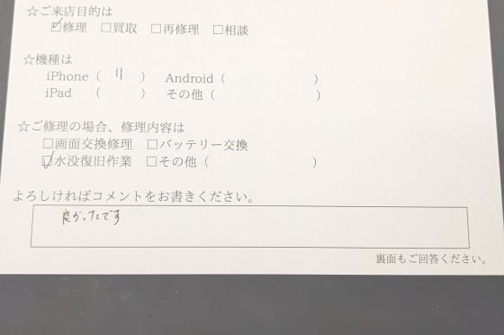 iPhone11画面、バッテリー交換修理のお客様よりコメントを頂きました。