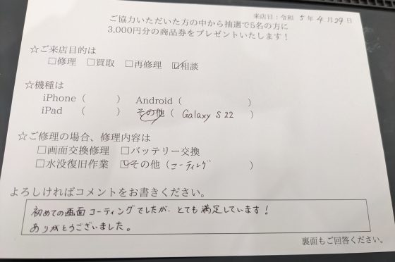 スマホのコーティングをご利用のお客様よりコメントを頂きました。