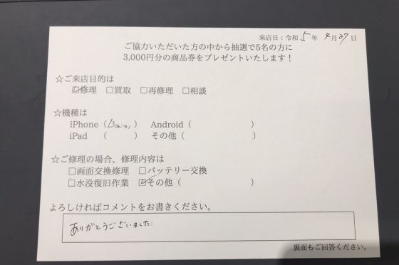 iPhoneの水没復旧のお客様よりコメントを頂きました。