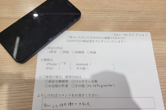 iPhone13mini修理のお客様よりコメントを頂きました。