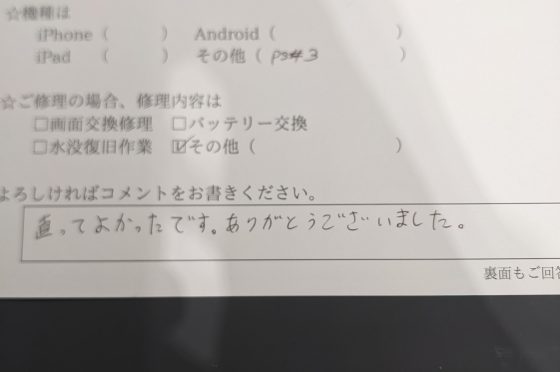 プレイステーション3の修理のお客様よりコメントを頂きました。