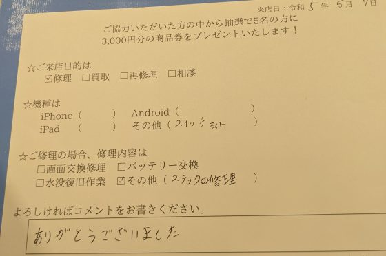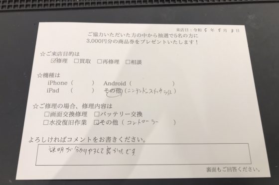 任天堂Switch Joy-conアナログスティック交換修理のお客様よりコメントを頂きました。