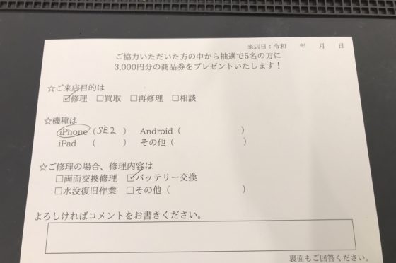 iPhoneSE2の修理のお客様よりコメントを頂きました。