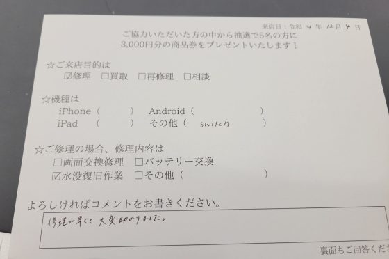 Switch水没復旧修理のお客様よりコメントを頂きました。