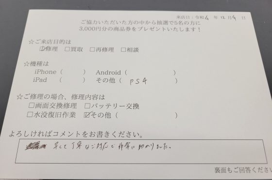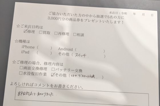 SwitchのSDカードスロットの修理のお客様よりコメントを頂きました。
