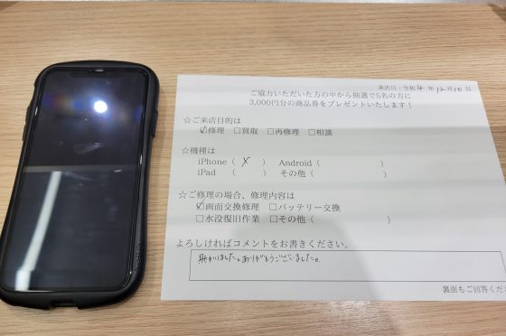 iPhonexの画面交換修理のお客様よりコメントを頂きました