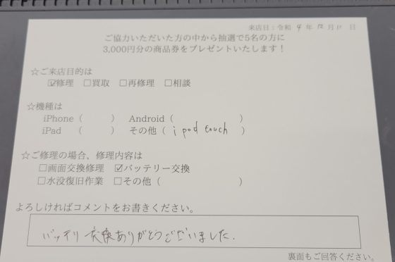 ipod touch第6世代のバッテリー交換修理のお客様からコメントを頂きました