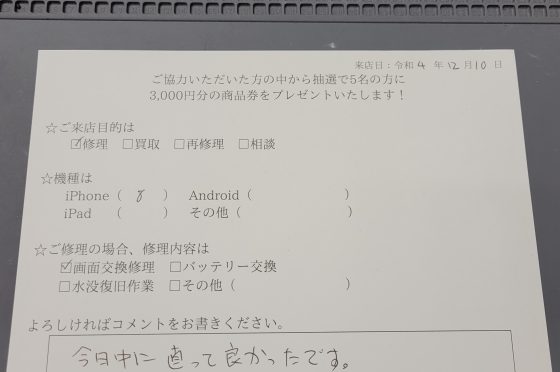 iPhone 8の画面交換修理のお客様からコメントをいただきました