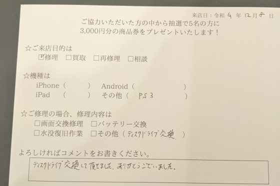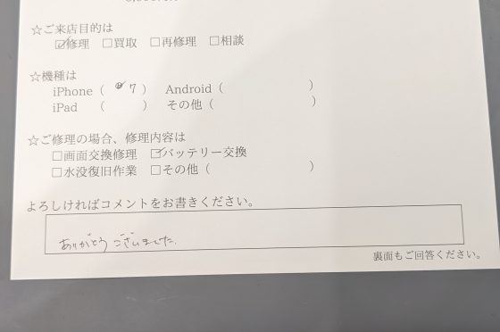 iPhone7のバッテリー交換のお客様よりコメントを頂きました。