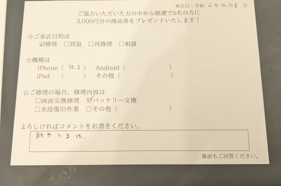 iPhonSE2のバッテリー交換のお客様よりコメントを頂きました。