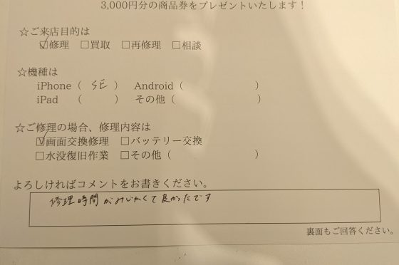 iPhoneSE2の画面交換修理のお客様よりコメントを頂きました。