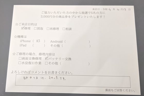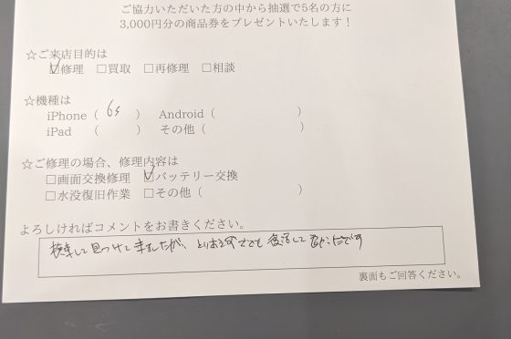 iPhone6sのバッテリー交換のお客様よりコメントを頂きました