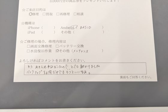 Android BASIOのメンテナンスの修理のお客様よりコメントを頂きました。