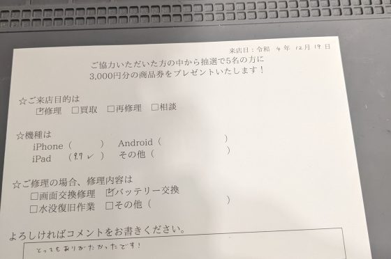 iPadのバッテリー交換のお客様よりコメントを頂きました。