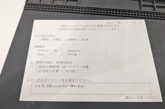 iPhoneXsの バッテリー交換のお客様よりコメントを頂きました