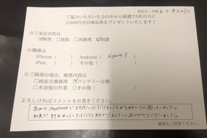 機種や修理箇所により異なりますが、最短15分~対応しています。目安としては30分~1時間弱で修理完了するものが多いです。充電口の交換や、カメラ修理など複数箇所の修理をご希望の場合でも、2〜3時間で修理可能となります。