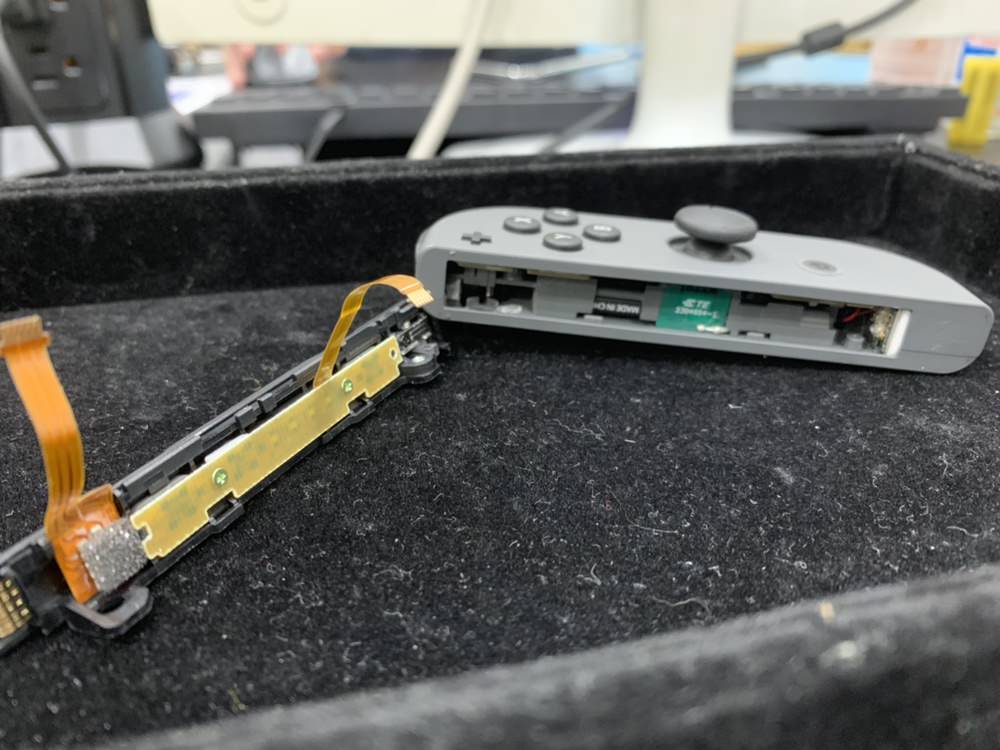 その結果ジョイコンのスライダー部分のパーツが外れてしまったことと、フレックスケーブルがすっぽりと外れてしまったようです。