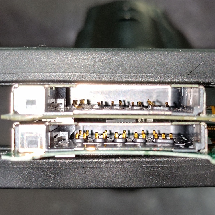 上のソフトトレーはピンが曲がってしまい、不揃いになってしまっているのが分かると思います。