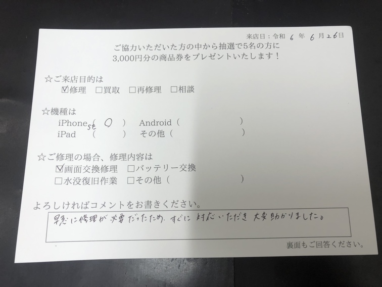 「 早急に修理が必要だったため、すぐに対応いただき 大変助かりました。 」