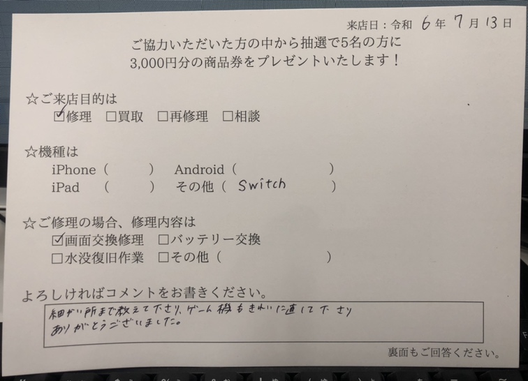 「 細かい所まで教えて下さり、ゲーム機もきれいに直して下さり ありがとうございました。」