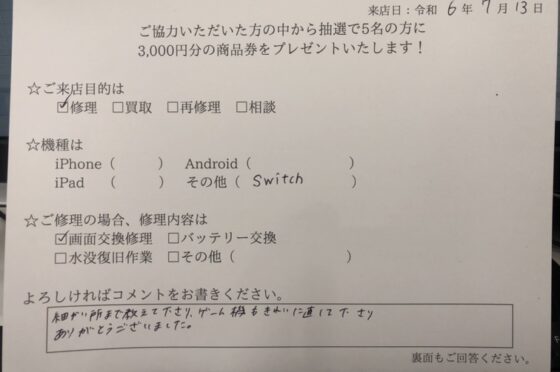 Switch、液晶交換修理をご依頼頂きました。