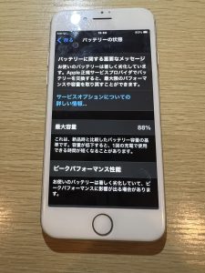 最大容量は88%と数字敵には大幅に劣化していないものの、バッテリーに関するメッセージが表示されていました。