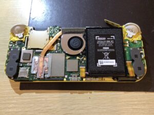 次に裏蓋を取り外すとバッテリーや冷却ファン、基板などのパーツが出てきます。