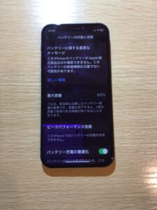 今回お預かりしたPhone12miniの最大容量はなんと63%まで低下していました。